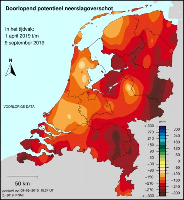 Landelijk is het verschil echter groot (figuur 2). Daar waar water aangevoerd kan worden, is ook relatief veel neerslag gevallen. In deze gebieden zijn deze zomer, in tegenstelling tot 2018, vrijwel geen problemen geweest met droogte of verzilting. Daar waar geen water kan worden aangevoerd, en waar men dus voor de watervoorziening volledig afhankelijk is van regen, is relatief weinig neerslag gevallen. In het oosten en uiterste zuidwesten van het land is het neerslagtekort dit jaar opnieuw opgelopen tot rond de 300 millimeter en gelijk aan de waardes van 2018 (figuur 3). In het (noord)westen is het neerslagtekort lokaal slechts rond 100 millimeter.