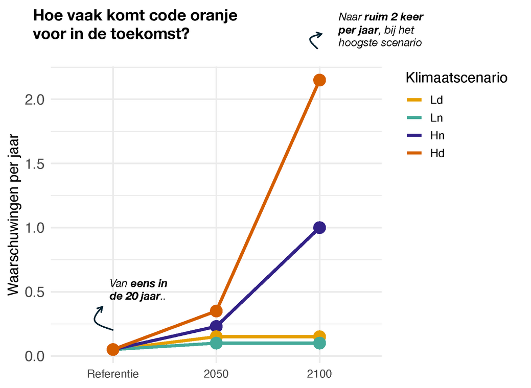 Volgens de KNMI’23-klimaatscenario’s neemt dus vooral het aantal codes oranje voor hitte toe. De duur en de maximumtemperatuur veranderen gemiddeld gezien weinig, maar bevatten wel zeldzame uitschieters ver naar boven. De toename van het aantal codes oranje voor hitte hangt sterk af van de uitstoot van broeikasgassen. Bij lage uitstoot komt het rond 2050 en 2100 eens per 6 tot 10 jaar voor, bij hoge uitstoot kan het aantal oplopen tot eens per 3 jaar rond 2050 en meer dan 2 keer per jaar rond 2100. Extreme hitte raakt gezondheid, landbouw, energie, natuur en infrastructuur. Deze resultaten onderstrepen het belang van tijdige voorbereiding op een toekomst waarin hitte vaker en extremer voorkomt.