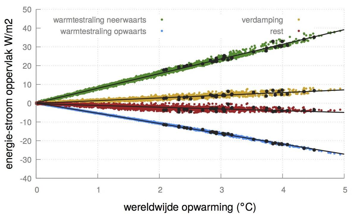 Door de opwarming neemt de warmtestraling toe doordat de atmosfeer warmer en vochtiger wordt. Deze toename is 7,3 Watt per vierkante meter per graad opwarming (Figuur 2). Daarmee kan verdamping en dus de neerslag met bijna 10% per graad opwarming toenemen. Echter 5,6 Watt per vierkante meter wordt door het oppervlak als warmtestraling weer uitgestraald waardoor er maar 1,7 Watt per vierkante meter overblijft, genoeg om de neerslag met 2% per graad opwarming te laten toenemen.