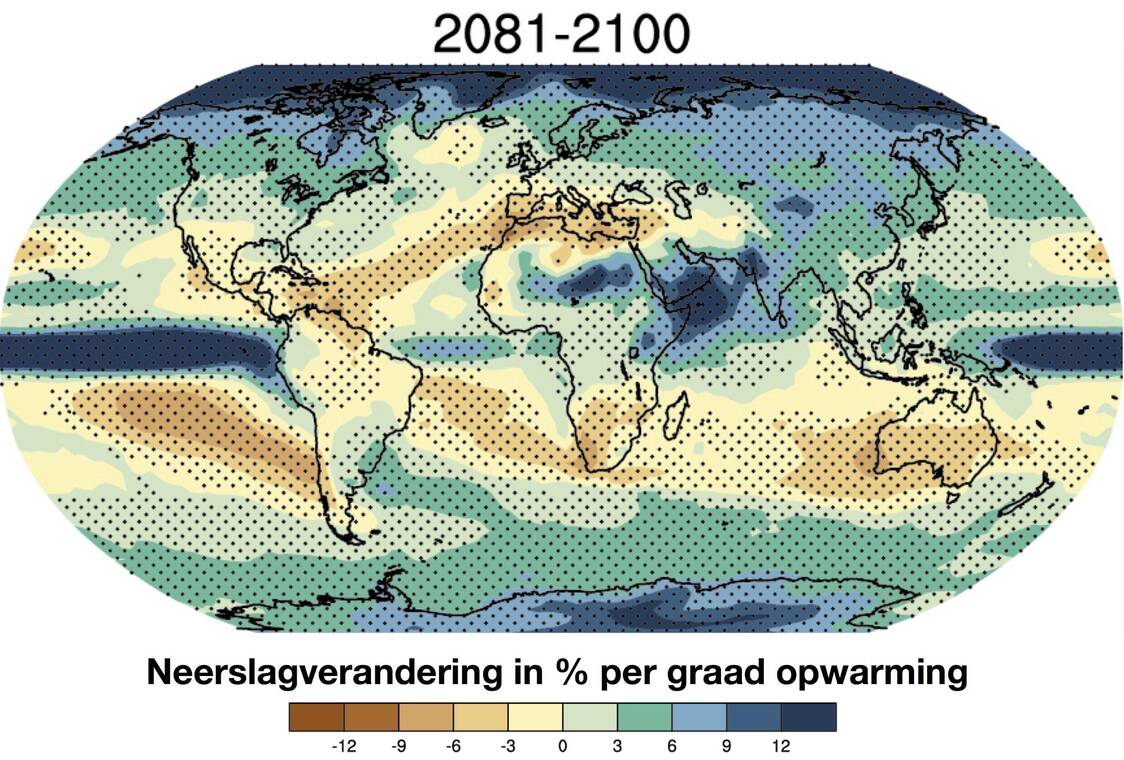 Door de opwarming gaat het over de hele wereld gemiddeld meer regenen. Maar niet overal valt meer regen. Ruwweg geldt dat natte gebieden natter worden en droge gebieden droger (Figuur 3).