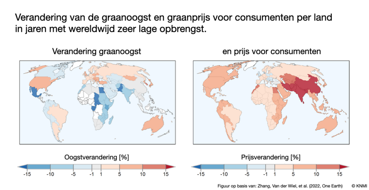 In een wereld met 2 °C opwarming en hogere CO2 concentraties ligt de wereldgemiddelde opbrengst van graan iets hoger dan nu (1,7 %, figuur 1). Regionaal bekeken is er een gemiddelde verlaging van opbrengsten dicht bij de evenaar (Afrika, Zuid-Azië), en een verhoging op hogere breedtegraden (V.S., China, Europa). Ondanks de gemiddelde toename van de graanopbrengst, neemt de gemiddelde prijs van graan voor consumenten toe (figuur 1).