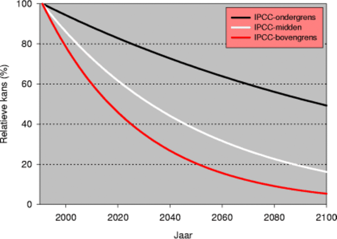 Berekende relatieve kans op een potentiële Elfstedentocht (ijsdikte in Friesland > 15 cm) voor de 21e eeuw. De ondergrens van het IPCC komt overeen met een temperatuurstijging van 0 graden in 1990 tot 1,4 graden in 2100. Bij het midden scenario bedraagt de stijging 3,6 en bij bovengrens 5,8 graden in 2100. Voor de berekening is aangenomen dat de temperatuurstijging tussen 1990 en 2100 lineair verloopt.