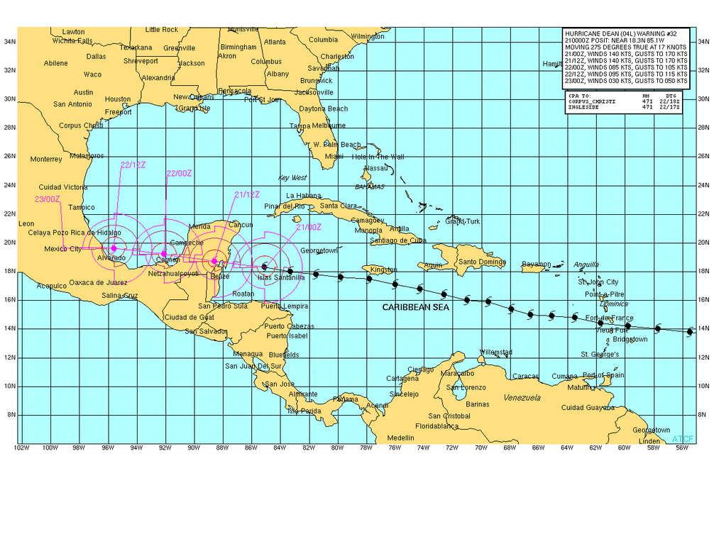 Dean was al enkele dagen een klasse 4 hurricane met windsnelheden rond 240 km/uur, maar vlak voor Yucatan nam de wind verder toe tot circa 270 km/uur. Tijdens windstoten zijn snelheden waargenomen van 300 km/uur! Dat is voor Nederlandse begrippen onvoorstelbaar. Een flinke storm haalt in ons land zo'n 100 km/uur. Opmerkelijk was ook de extreem lage luchtdruk in het oog van de orkaan. Uit dropsonde metingen vanuit vliegtuigen blijkt dat de druk gedaald was tot 906 hPa (= mbar). Dat is sinds 1935 de op twee na laagste luchtdruk op moment dat een hurricane die aan land komt. Nog lager was de druk in huricane Wilma die in oktober 2005 met 882 hPa in Yucatan aan land kwam. Wereldwijd staat het drukrecord op naam van tyfoon Tip bij Guam in de Pacifische Oceaan met een luchtdruk van 870 hPa op 12 oktober 1979.