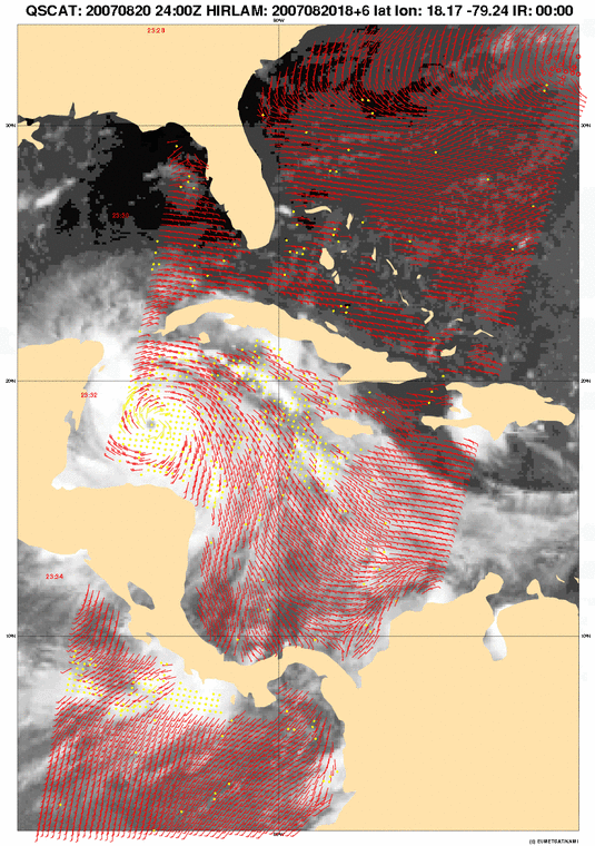 Windrichting en snelheid aan het oppervlak van de zee worden ook gemeten met een scatterometer, een satelliet radarinstrument aan boord van de ERS en MetOp satellieten. In opdracht van EUMETSAT verwerkt het KNMI momenteel gegevens van drie verschillende scatterometers van EUMETSAT, ESA en NASA/NOAA, waardoor de ontwikkeling in kracht en afmeting goed gevolg kan orden. Scatterometerwinden zijn gemiddelden over een gebied ter grootte van 25 km. De maximaal lokaal gemeten winden zijn ruwweg twee keer zo intens. Onder dit artikel een afbeelding van een scatterometerplaatje van Dean aangemaakt op het KNMI (met NOAA/NASA gegevens).
