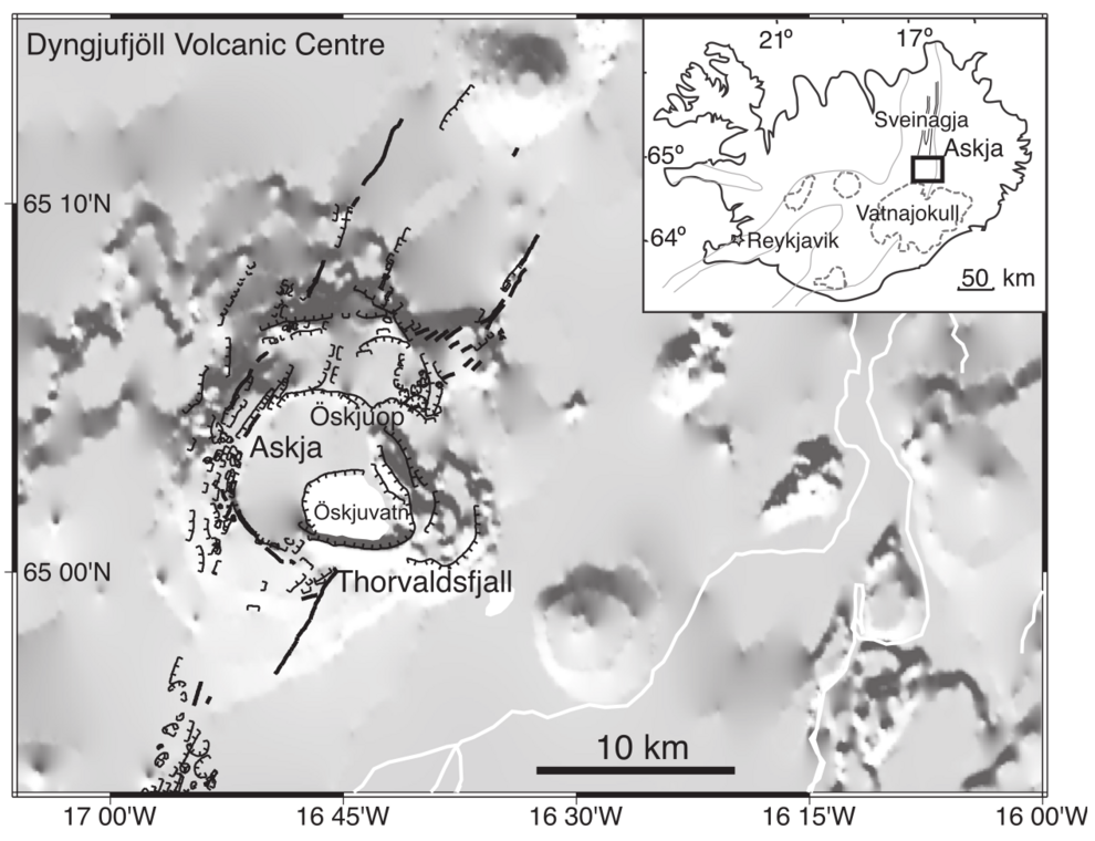 Askja ligt in het binnenland van het eiland in de wildernis (figuur 1) en wordt gekenmerkt door een grote krater met een doorsnede van acht kilometer. De recente deformatie van Askja is goed te zien op satellietbeelden, die weergeven hoe de vulkaan omhoog is gekomen tussen juli 2021 en juli 2022 (figuur 2).
