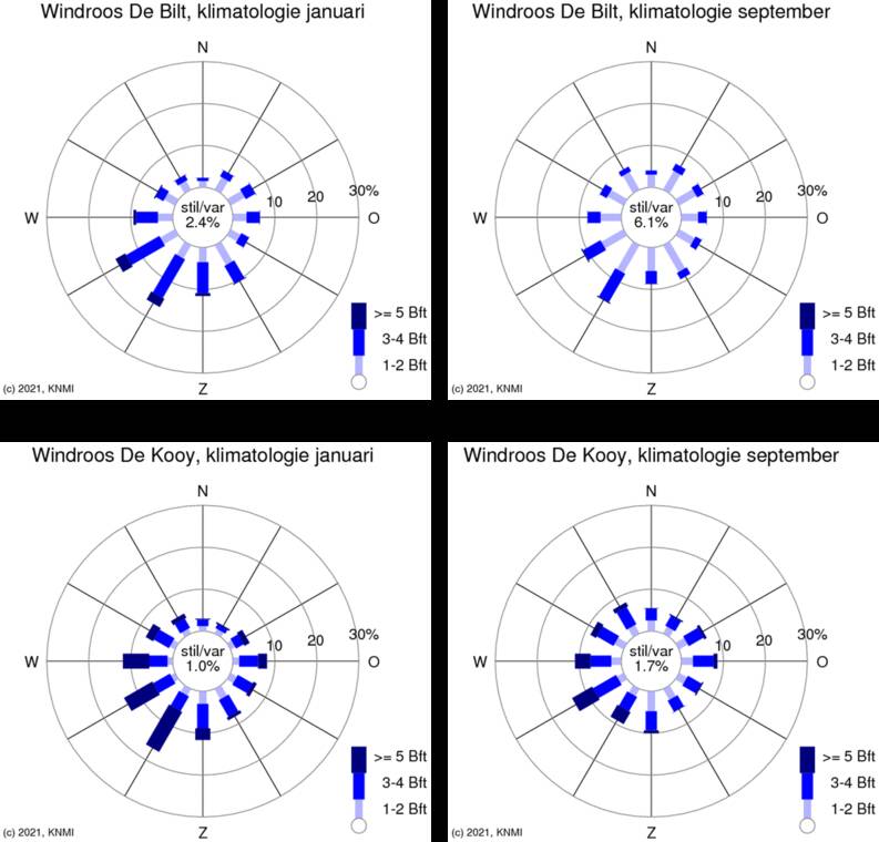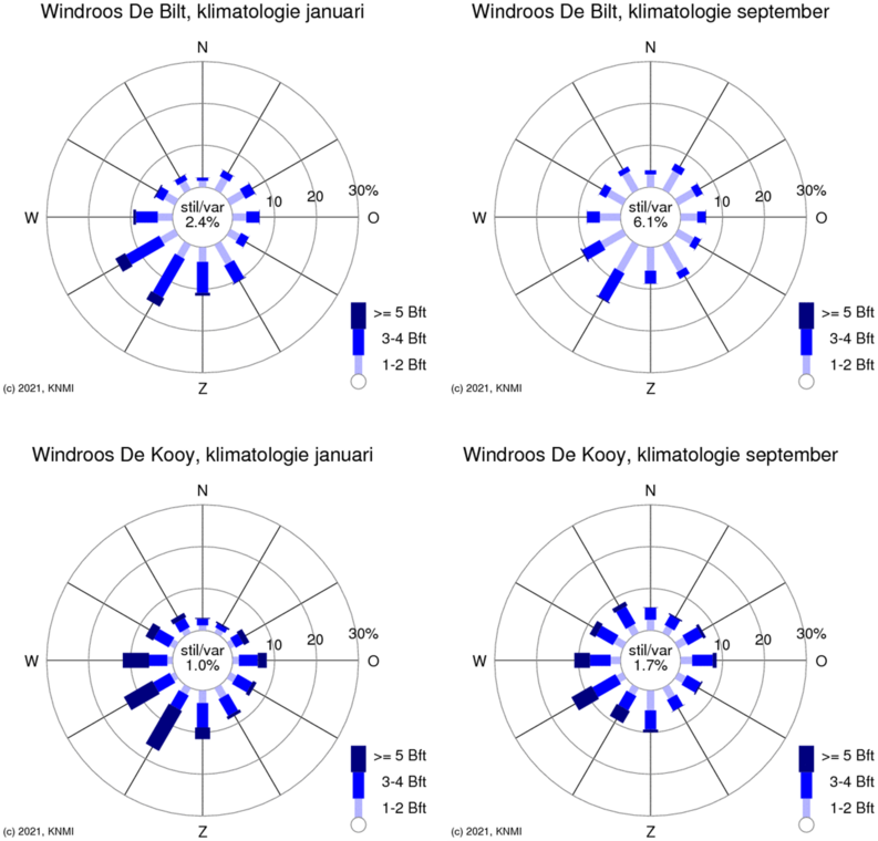 De figuur toont de windroos voor het langjarig gemiddelde (1991-2020) in september en januari. Boven voor het meetstation De Bilt bij het KNMI en onder voor het meetstation De Kooy bij Den Helder. In De Bilt is het in september gemiddeld 6 procent van de tijd windstil en staat er vrij vaak maar windkracht 1 of 2. In Den Helder, vlak bij zee, is het bijna nooit windstil en komt windkracht 3 of 4 veel vaker voor. Gezien over het hele jaar komt rustig weer het meest voor landinwaarts in de nazomer, vooral in de maanden augustus en september. In januari komt windstil weer maar weinig voor: ruim 2 procent van de tijd in De Bilt en ongeveer 1 procent van de tijd in Den Helder.