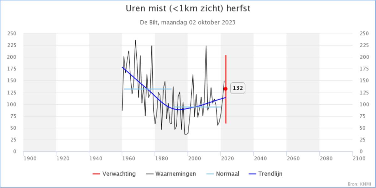 Zodra de wind wegvalt kan door een snelle afkoeling van met waterdamp verzadigde lucht al snel mist ontstaan. Voor veel en langdurige mist moet het trouwens wel een klein beetje blijven waaien. De mistvorming wordt door een licht briesje juist versterkt omdat de mistdruppeltjes zich daardoor gemakkelijker mengen en zich naar boven toe verspreiden waardoor de mistlaag dikker wordt. Toch komt mist verreweg het meest voor bij rustig weer (windkracht 2 of minder) en verreweg het meest in de herfst en de winter. Hoe vaak het mistig is, verschilt daarbij veel van jaar tot jaar (figuur 2). Dit hangt samen met de dominante weersystemen in het seizoen. Veel rustig weer hangt nauw samen met de aanwezigheid van een hogedrukgebied. Vaak is het overdag, na het optrekken van de mist, dan ook juist erg mooi en zonnig weer. Het KNMI geeft vooral in de herfst en winter geregeld waarschuwingen af voor (dichte) mist. Door het schoner worden van de lucht in Nederland komt (dichte) mist tegenwoordig minder vaak voor dan voor 1980 (figuur 2).