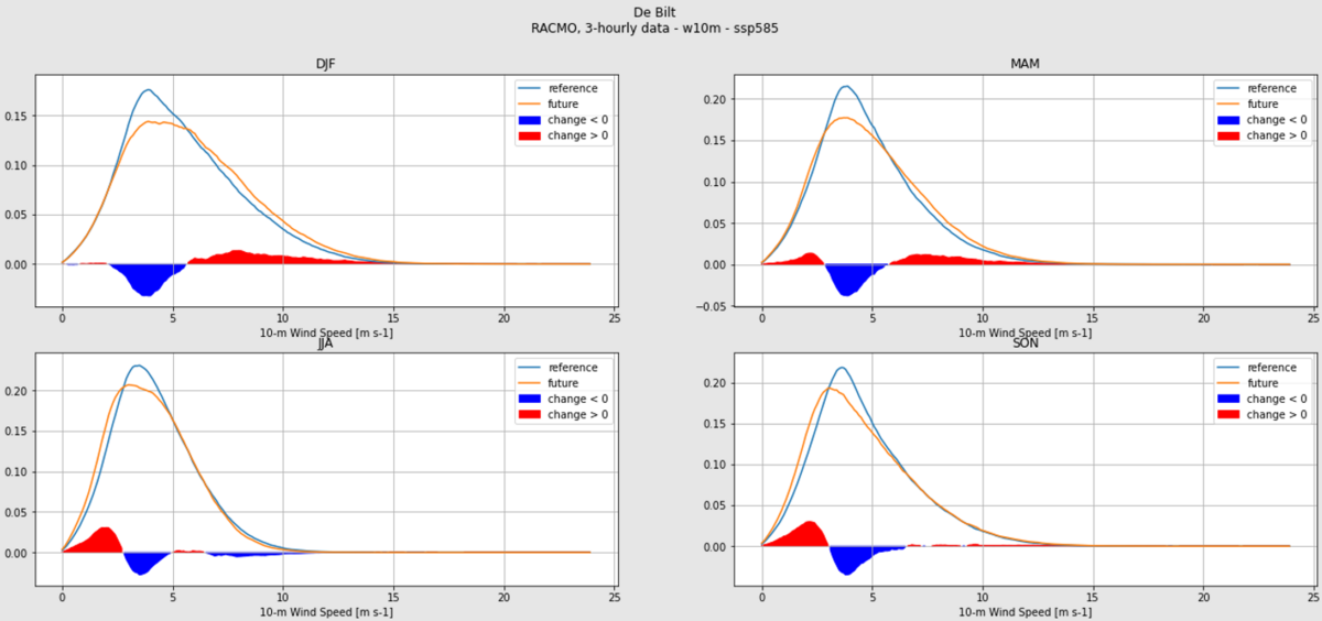 Het onderzoek met klimaatmodellen laat zien dat rustig weer in de toekomst in Nederland iets vaker voorkomt (figuur 3). In de zomer (JJA) en het najaar (SON) nemen de frequentie en de lengte van rustige perioden (windsnelheid minder dan 3,3 m/s; maximaal 2 Beaufort) met enkele procenten toe. We verwachten dus dat rustig nazomerweer iets vaker voorkomt.