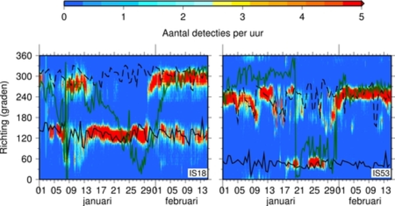 De grafieken geven aan uit welke richting infrageluidobservaties van oceaangolven komen gedurende januari en de eerste helft van februari in 2009. Een richting van 0 graden betekent dat de bron zich ten noorden van de meetopstelling bevindt en 90 graden ten oosten. De linker grafiek geeft de resultaten voor IS18 op Groenland weer; de rechter grafiek die van IS53 in Alaska. De doorgetrokken zwarte lijn geeft de richting naar bronnen op de Atlantische Oceaan (in het oosten) ten opzichte van het array. De zwarte onderbroken lijn correspondeert met de Grote Oceaan (in het westen). De windrichting op 50 km hoogte nabij de meetopstelling wordt door de donkergroene lijn weergegeven en volgt uit analyses van weermodellen van het ECMWF.