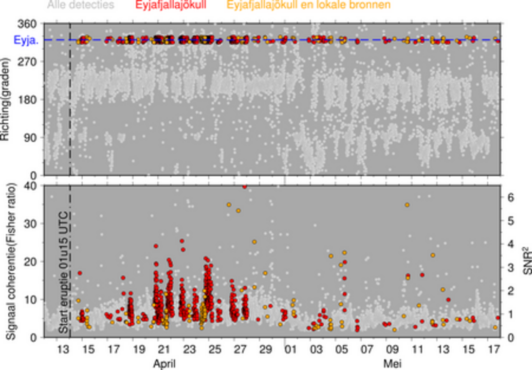 Sinds het begin van de erupties (14 april 2010) wordt vooral 's nacht infrageluid uit de richting van Eyjafjallajökull gedetecteerd. 's Nachts als de zon onder is, kan de atmosfeer zich stabiliseren. Deze “rustige atmosfeer” levert de meest gunstige condities om infrageluid te meten. Overdag is er wind, turbulentie en zijn er ook lokale infrageluid bronnen actief.