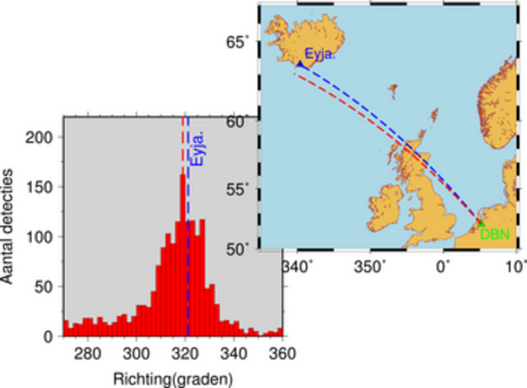 Infrageluid reist door de hoge atmosfeer waarbij stratosferische winden, rond de 50 km hoogte, een sterke invloed hebben op de geluidsvoorplanting. Deze winden zijn momenteel naar het westen gericht waardoor de geobserveerde richting afwijkt van de werkelijke richting van het De Bilt Infrageluid (DBN) naar de Eyjafjallajökull.