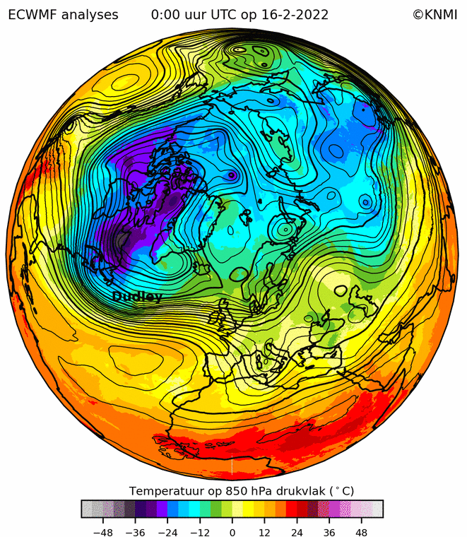 Dat we dit jaar zoveel stormen hebben, heeft deels te maken met de sterke poolwervel in de stratosfeer, de luchtlaag op 10 tot 50 kilometer hoogte. Door de aanhoudend sterke poolwervel deze winter krijgen verstoringen van de straalstroom in de troposfeer minder kans de straalstroom op te breken. Daardoor overheersen de sterke westenwinden nu al wekenlang en wordt de ene na de andere storm richting Europa gevoerd. In een animatie van de drie stormen Dudley, Eunice en Franklin op basis van satellietbeelden is de snelle ontwikkeling en verplaatsing van de stormen goed zichtbaar (figuur 1 en 2).