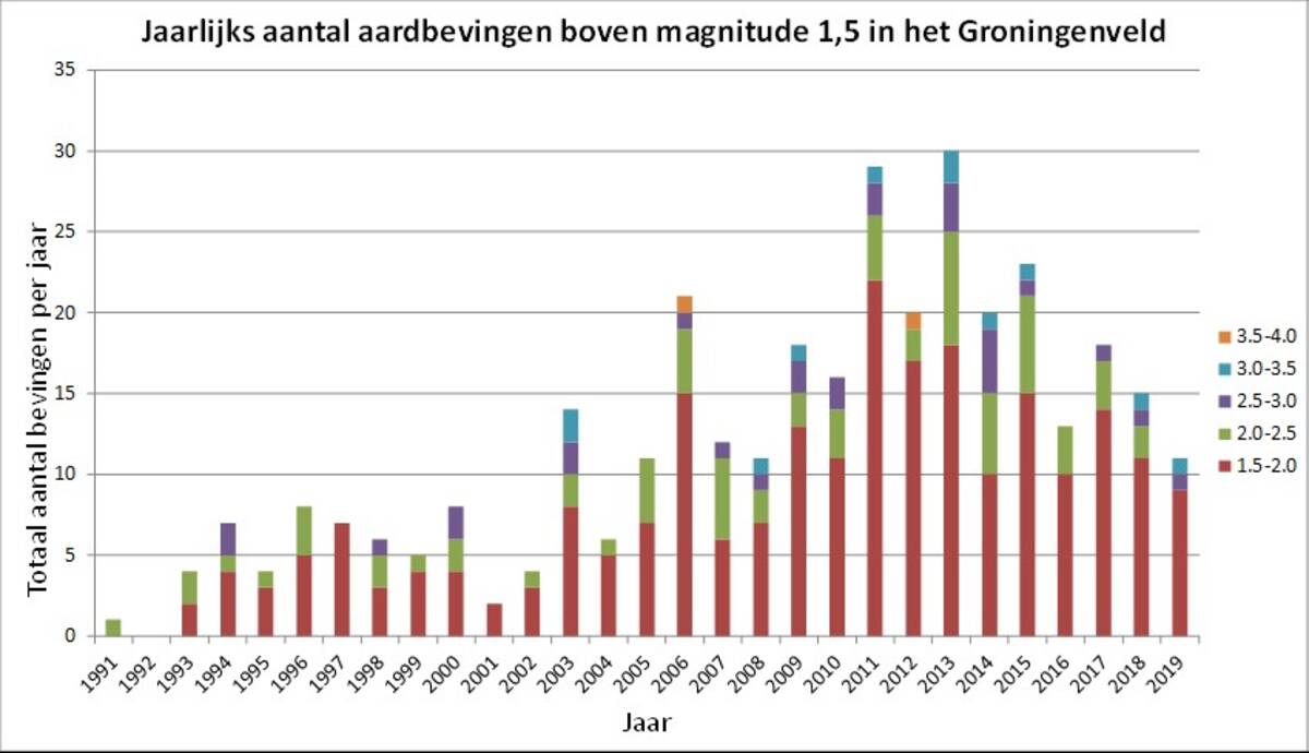 Hiervan zijn er 11 met een magnitude groter dan 1,5 op de schaal van Richter (zie figuur 2). In 2018 waren dit er 90 waarvan 15 bevingen groter dan 1,5. Om de verschillende jaren met elkaar te kunnen vergelijken, wordt er ook naar het aantal aardbevingen met een magnitude hoger dan 1,5 gekeken. In de loop van de jaren is het meetnetwerk in Groningen uitgebreid waardoor steeds kleinere bevingen gemeten kunnen worden. Aardbevingen met magnitude van 1,5 en hoger zijn sinds 1991 allemaal gemeten in het Groningen-gasveld, ook toen er in het begin nog met minder instrumenten gemeten werd. Hiermee lijkt de afname in het aantal die de laatste jaren zichtbaar is door te zetten.