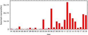 De magnitude is een maat voor de kracht van de beving. Daarnaast wordt gekeken naar het seismisch moment, een maat voor de energie die vrijkomt bij een aardbeving. Met het totale seismische moment per jaar wordt door zowel het aantal als de kracht van de aardbevingen bepaald. Het seismisch moment van dit jaar is vergelijkbaar met dat van 2018 (figuur 3) waaraan de bevingen met een kracht van 3,4 die in beide jaren optrad sterk bijgedragen heeft.