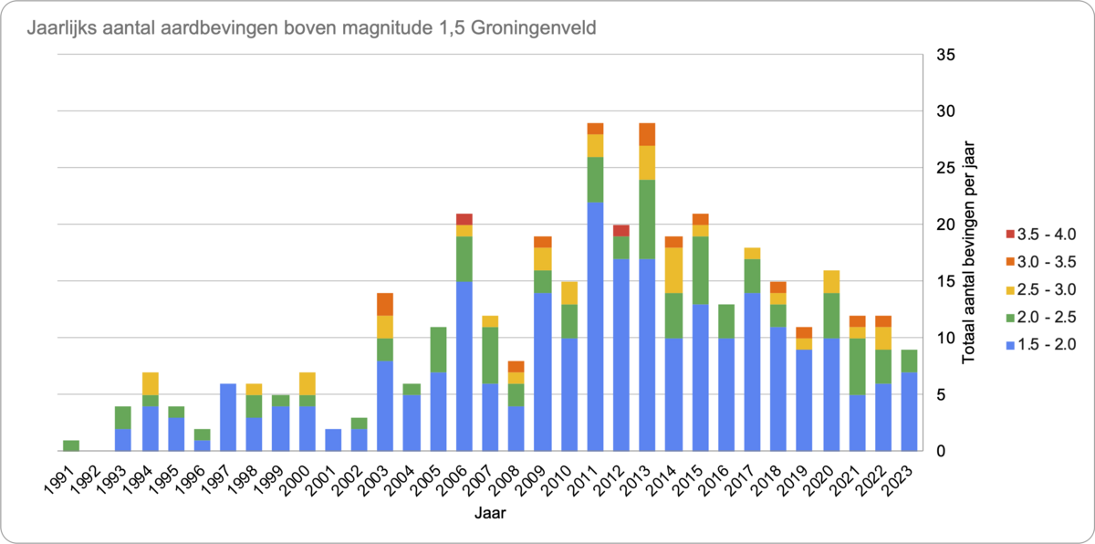 Het seismisch meetnetwerk in Groningen is in de loop der jaren uitgebreid. Daardoor kunnen er meer en kleinere aardbevingen gemeten worden. Alle aardbevingen van 1,5 en hoger zijn sinds 1991 gemeten. Door naar deze aardbevingen te kijken, kunnen de verschillende jaren met elkaar vergeleken worden.