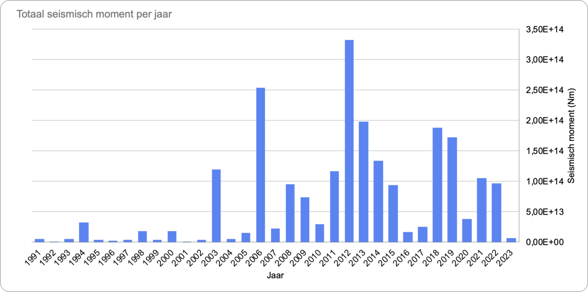 Ook het seismisch moment, de totale hoeveelheid vrijgekomen energie, laat dit jaar een daling zien (figuur 3). In 2022 en 2021 vonden er aardbevingen met magnitudes hoger dan 3 plaats. Dit verklaart de daling in het seismische moment in 2023 ten opzichte van deze eerdere jaren.