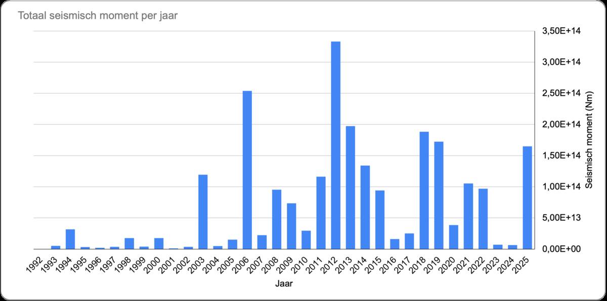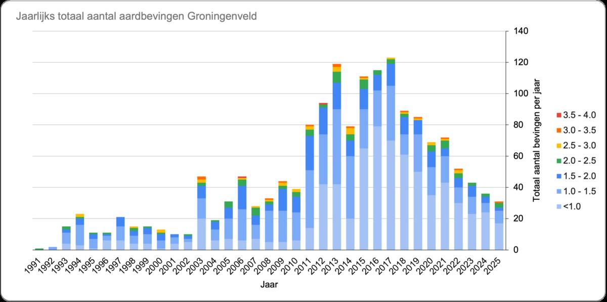 Geïnduceerde aardbevingen zijn het gevolg van menselijk handelen, vaak is gaswinning de oorzaak. In het Groningenveld treden de meeste geïnduceerde aardbevingen op, ondanks dat de gaswinning gestopt is. In totaal waren er 31 aardbevingen in het Groningenveld (figuur 1), waarvan 6 met een magnitude van 1,5 of hoger. Bevingen van 1,5 of hoger zijn altijd gemeten, ook toen het seismisch netwerk nog minder dicht was. Hiermee kan de ontwikkeling van de seismiciteit over de jaren gevolgd worden. Het aantal aardbevingen van 1,5 en hoger bleef gelijk aan 2024 (figuur 2).