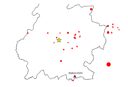 Het kaartje laat Zuid-Limburg zien met een gele ster op de plaats van de aardbeving. Het plaatje hieronder is de registratie van de grondbeweging in station HGN (Heimansgroeve) in Limburg. De grondbeweging wordt in drie richtingen (Vertikaal, Noord-Zuid en Oost-West) geregistreerd. De tijd in seconden loopt van links naar rechts. Op dit seismogram zijn onder andere de P-golven (eerst aankomende golven), de S-golven (met de grootste amplitude) te zien. De afstand van HGN tot het epicentum is 14 kilometer.