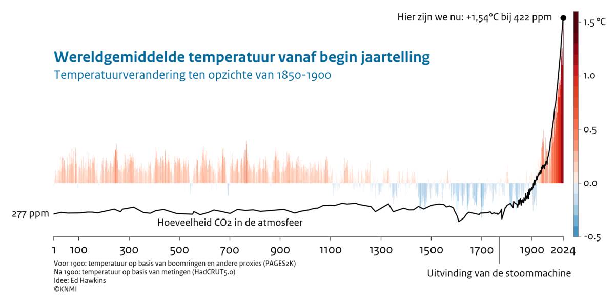 De klimaatstreepjescode waar we elk jaar een streep voor de gemiddelde temperatuur in De Bilt van dat jaar aan toevoegen, begint bij 1901. Dat is het begin van onze officiële metingen. Maar hoe was de temperatuur daarvoor op aarde? Directe metingen gaan hooguit een paar honderd jaar terug. De temperaturen in een verder verleden zijn afgeleid uit onder meer de dikte van boomringen. Daaruit blijkt dat de temperatuur op aarde in de afgelopen honderd jaar sterk is gestegen. Met 2024 als voorlopig het warmste jaar sinds het begin van de jaartelling.
