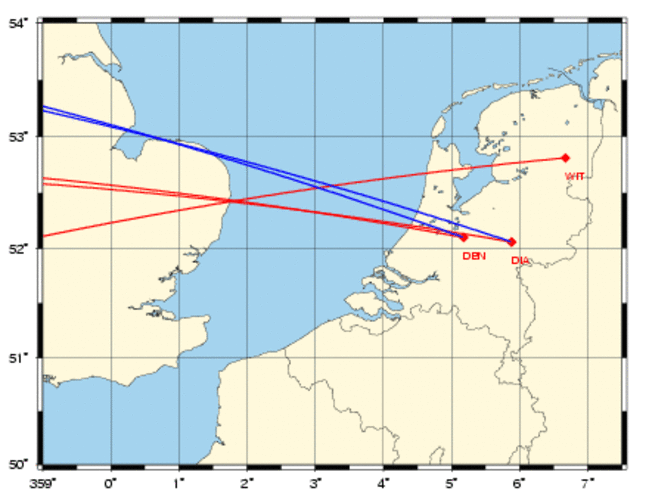 Het KNMI heeft meldingen ontvangen over knallen en trillingen in de omgeving van Den Haag. Infrageluid van deze gebeurtenissen is ook gemeten op arrays in Witteveen (WIT) en Deelen (DIA). Zodoende kan de bron gelokaliseerd worden door kruispeiling, bijstaand figuur geeft deze lokaties.