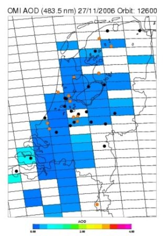 Kaart van de meetlokaties (twaalf scholen en KNMI, oranje stippen) tijdens de campagne, met daaroverheen een voorbeeld van een OMI-meting van de hoeveelheid aerosol (27 november 2006). Elk rechthoekig vlakje is een individuele aerosolmeting door OMI, de kleur is een maat voor de hoeveelheid aerosol. Zonder scholen zou de vergelijking beperkt zijn tot de meting die over het KNMI-grondstation ligt. Dat sommige scholen binnen dezelfde OMI-meting vallen levert voor het onderzoek waardevolle extra gegevens op. Waar geen kleur is ingevuld, was het te bewolkt om een betrouwbare aerosolwaarde af te leiden uit de meting. Zwarte stippen zijn GLOBE-scholen die niet meedoen in de campagne.