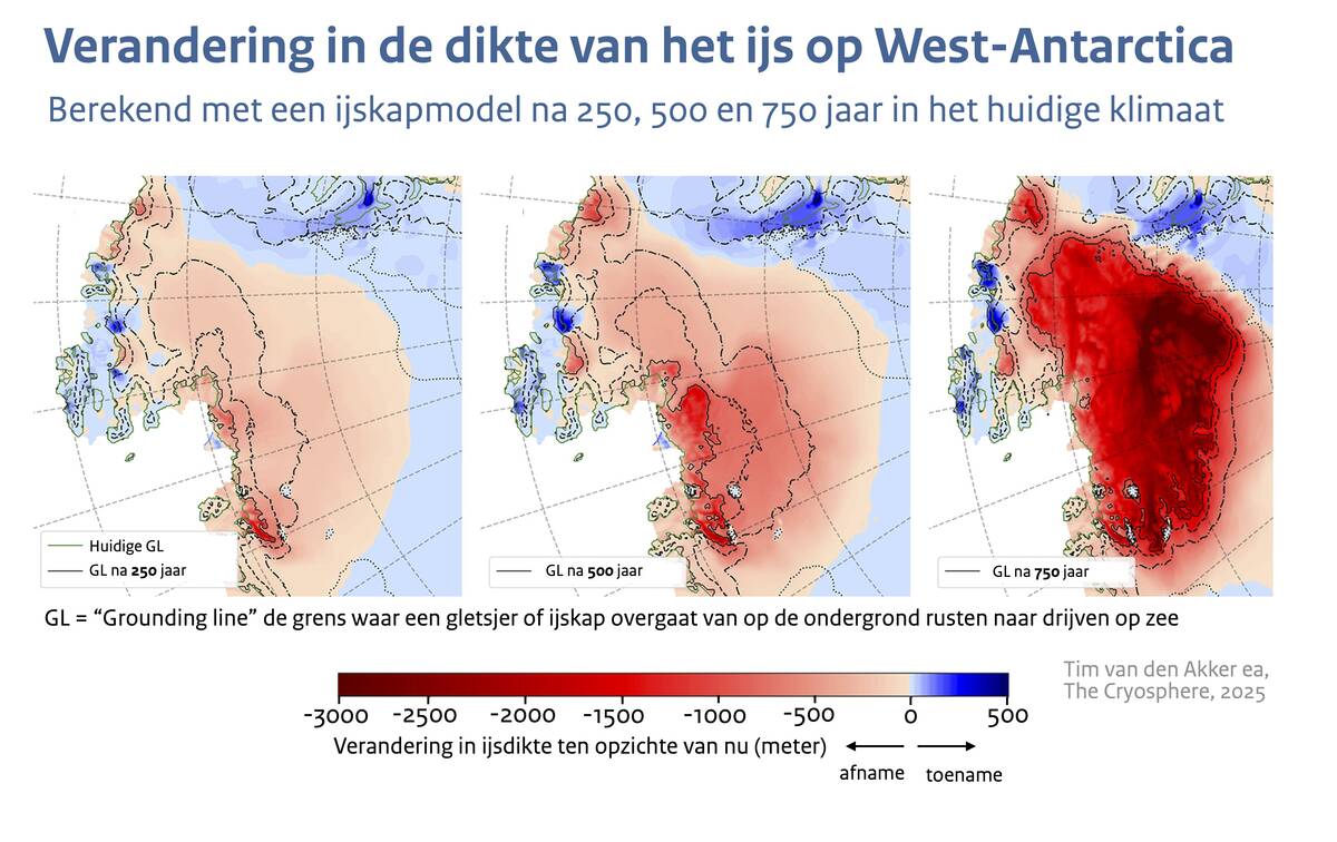 De resultaten van deze studie schetsen een zeer zorgelijk beeld. Het blijkt namelijk dat zelfs als de opwarming nu abrupt zou stoppen (een uiterst optimistisch/onrealistisch scenario) deze twee gletsjers op termijn toch grotendeels zullen verdwijnen (afbeelding 2), eerst geleidelijk, maar uiteindelijk uitmondend in een snelle ineenstorting (afbeelding 3). Dit betekent dat de mondiale zeespiegel onherroepelijk met minstens 1 meter zal stijgen (1,25 m voor Nederland). De studie laat tegelijkertijd zien dat deze ineenstorting minstens 300 jaar zal duren. Modelberekeningen voor een (meer realistisch) verder opwarmend klimaat geven aan dat deze termijn dan 25-100 jaar korter wordt, en dat de bijbehorende zeespiegelstijging in het jaar 2100 verdubbelt. Met andere woorden, de ineenstorting van deze twee gletsjers is onvermijdelijk, maar de periode waarover dit gebeurt is afhankelijk van de mate van opwarming veroorzaakt door het uitstoten van broeikasgassen.