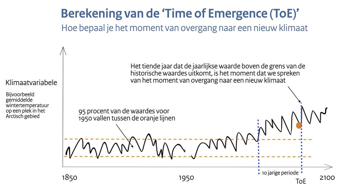 Om dit vast te stellen, gebruiken we het concept "Time of Emergence" (ToE). We definiëren de ToE als het moment waarop tien jaar op een rij de jaarlijkse waardes groter (of kleiner) zijn dan het grootste deel (97,5 procent) van de jaarlijkse waardes in het verleden (afbeelding 1). Hiertoe hebben we gebruik gemaakt van de resultaten van 15 klimaatmodellen die het klimaat voor de periode 1850-2100 hebben berekend op basis van historische (1850-2014) broeikasgasconcentraties en aerosolen en een toekomstig (2015-2100) hoog scenario voor uitstoot van broeikasgassen en aerosolen (SSP5-8.5). Deze modellen laten allemaal langjarige trends en variabiliteit zien, en we hebben voor elk van deze modellen, voor elk seizoen, elke relevante klimaatvariabele en elk Arctisch gebied de ToE bepaald.
