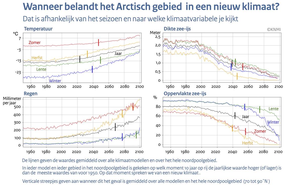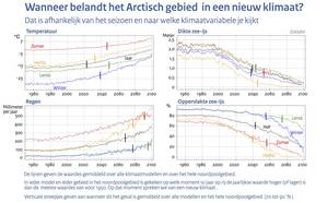 Aan het eind van de winter bereikt het Arctische zee-ijs zijn jaarlijkse maximum. Dit jaar gebeurde dat op 22 maart. Satellieten maten een oppervlakte van 14,3 miljoen vierkante kilometer ijs, de laagste waarde sinds het begin van de metingen in 1978. Is zo'n lage waarde een teken dat het noordpoolgebied al in een nieuw klimaat terecht is gekomen? Of zien we de komende jaren wellicht weer meer zee-ijs? In een net verschenen studie in Nature Scientific Reports laten we zien dat het erg afhangt van het seizoen en naar welke klimaatvariabele en gebied je kijkt in het Arctisch gebied wanneer het nieuwe klimaat zijn intrede doet.