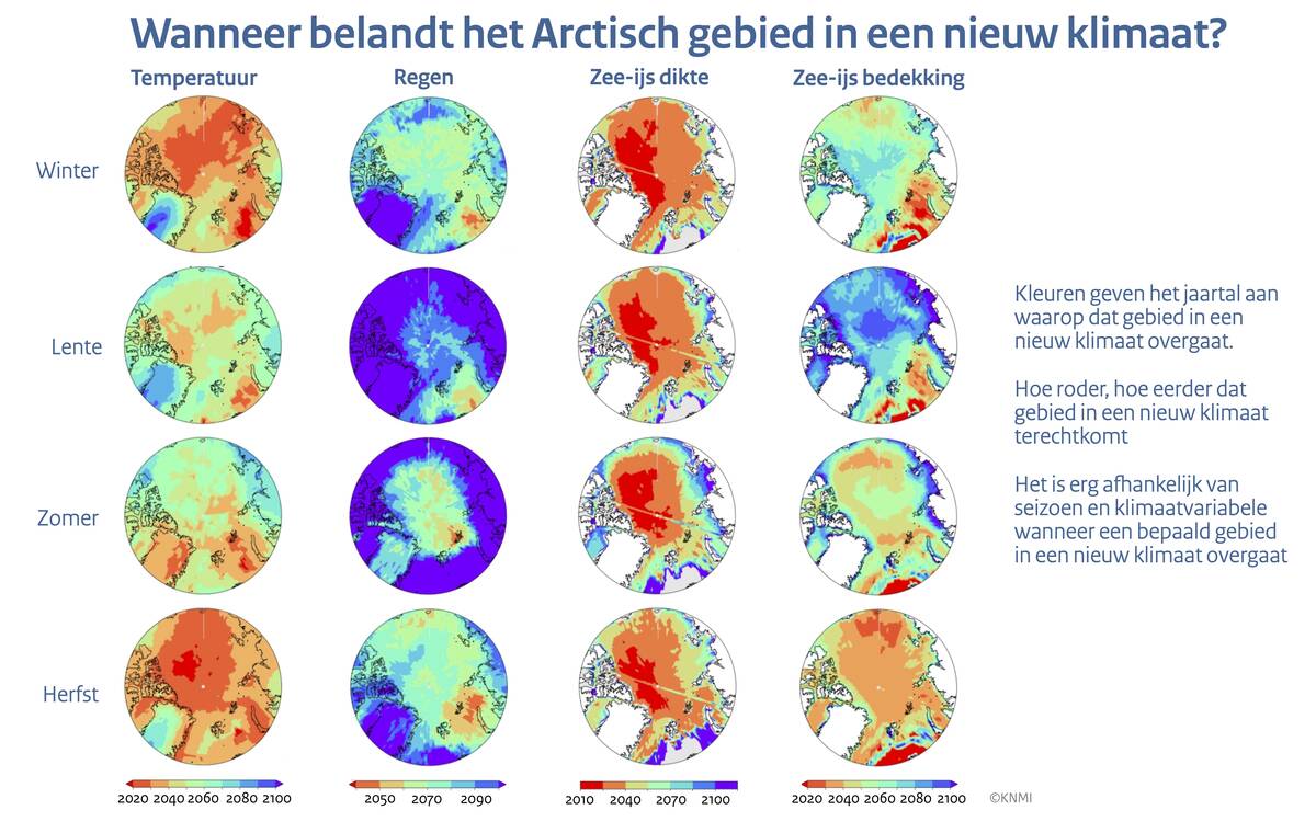 Afbeelding 3 laat de ToE waarden per variabele, per seizoen en per gebied zien. Hieruit blijkt dat voor sommige gebieden de ToE al wel in het (nabije) verleden ligt, zoals voor temperatuur in de winter in de Barents Zee (vanwege de enorme opwarming aldaar). Ook de zee-ijsbedekking in de gebieden aanpalend aan de Noord-Atlantische Oceaan is al in een nieuwe staat beland (wat in feite inhoudt dat daar nauwelijks zee-ijs over is). Interessant is ook dat zee-ijsdikte in de centrale Arctic al in een nieuwe staat is beland, wat het gevolg is van een sterke verdunning van het zee-ijs en relatief kleine jaar-tot-jaar variaties. Wellicht is zee-ijsdikte dus wel de klimaatvariabele die het duidelijkst aangeeft dat de Arctic al in een nieuwe klimaattoestand is beland, of dat spoedig zal zijn. Ten slotte vallen de relatief “late” ToE-waarden voor neerslag en regenval op, ondanks de sterke trend daarin. Dit laat zien hoe enorm (en bovendien sterk toenemend) de jaar-tot-jaar fluctuaties in neerslag en regenval in de Arctic zijn.
