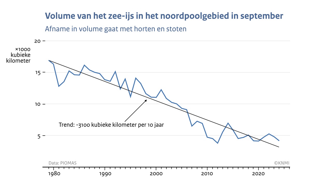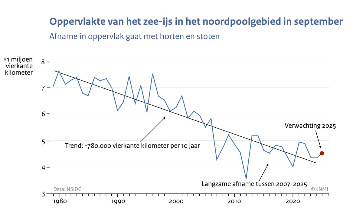 Aan het einde van het smeltseizoen, in september, is de zee-ijsbedekking in het noordpoolgebied normaal het minst. Na een record laag maximum in maart, ligt de omvang van het zee-ijs nu op de 10e plaats sinds het begin van de metingen. Sinds ongeveer 20 jaar neemt het Arctisch zee-ijs veel minder snel in omvang af dan daarvoor, met name in september. Klimaatmodellen laten zien dat natuurlijke schommelingen in het klimaat tijdelijk tegengas kunnen geven aan het aanhoudende verlies van zee-ijs in een opwarmend klimaat.