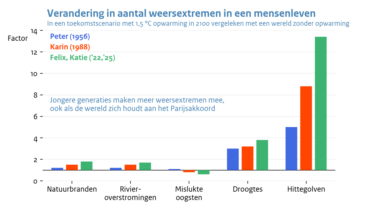 Klimaatverandering raakt ons allemaal, maar niet op dezelfde manier. Kinderen die nu geboren worden, zullen tijdens hun leven 13 tot 30 keer zoveel hittegolven meemaken dan wanneer zij geboren zouden zijn in een wereld zonder klimaatverandering. Maar voor iedereen geldt inmiddels, klimaatverandering zorgt ervoor dat het weer in ons leven al anders is dan voor voorgaande generaties.