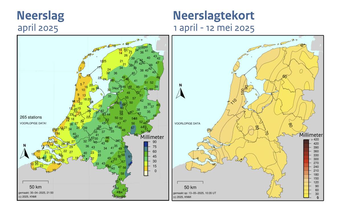 Waar de regen begin vorig jaar nog met bakken uit de hemel kwam is het dit jaar al sinds februari droger dan gebruikelijk. Het neerslagtekort, het verschil tussen de neerslag en de verdamping, is vanaf 1 april gemiddeld over het land inmiddels opgelopen tot 91 millimeter. Het is daarmee net zo droog als rond dezelfde tijd in het recorddroge jaar 1976. Ook de komende twee weken wordt er weinig neerslag verwacht, waardoor het neerslagtekort nog verder zal oplopen.