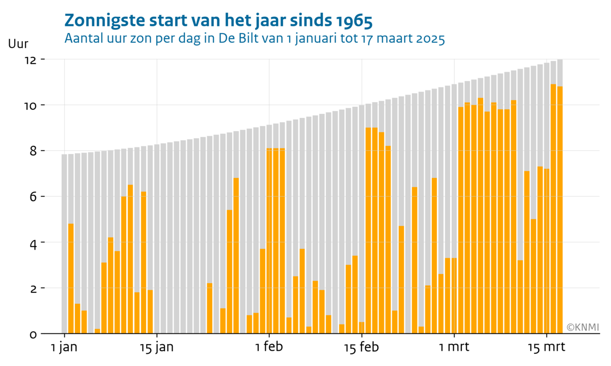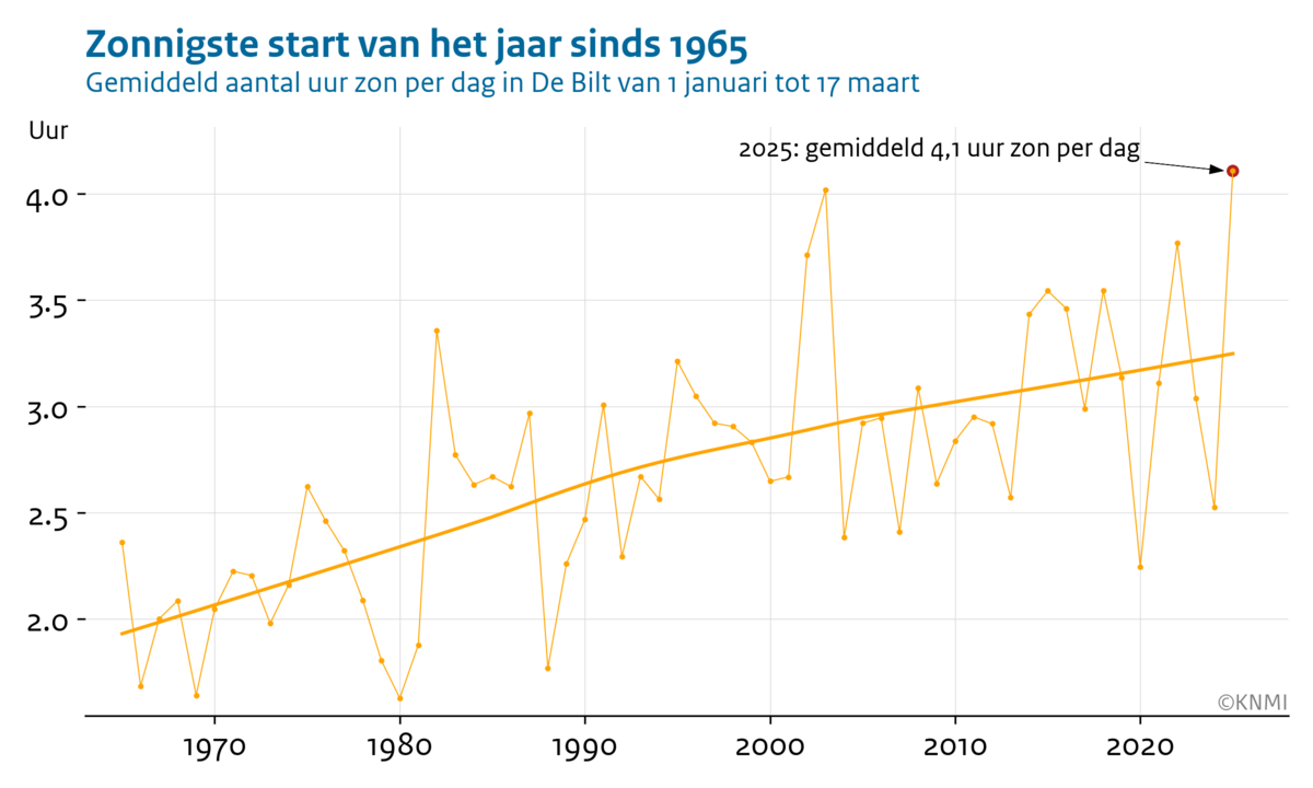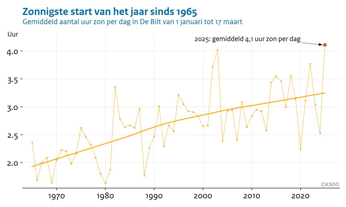 Het totaal aantal zonuren van 2025 tot en met 17 maart komt daarmee op 313 uur. Dat is gemiddeld 4,1 uur per dag, een record. Hiervoor stond het record op het jaar 2003, met 305 uur zon.
