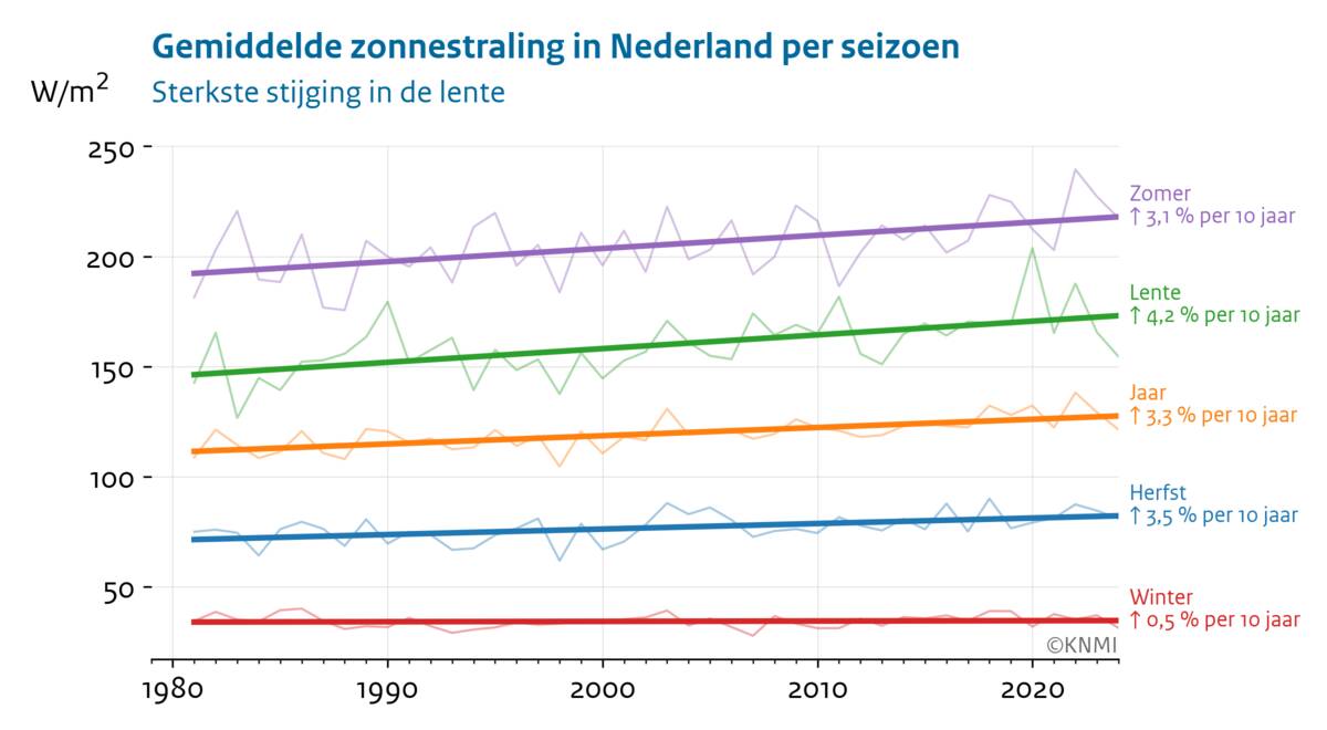 Het wordt steeds zonniger in Nederland. Sinds begin jaren tachtig is een stijgende trend zichtbaar van gemiddeld 3,3 procent per decennium. Deze toename geldt voor alle seizoenen en is het sterkst in de lente. De voornaamste oorzaak is dat de lucht helderder is geworden onder andere door minder luchtvervuiling. Tegelijkertijd is het iets vaker gaan waaien uit minder zonnige windrichtingen, voornamelijk het zuiden en zuidwesten. Anders was de toename nog iets groter geweest.