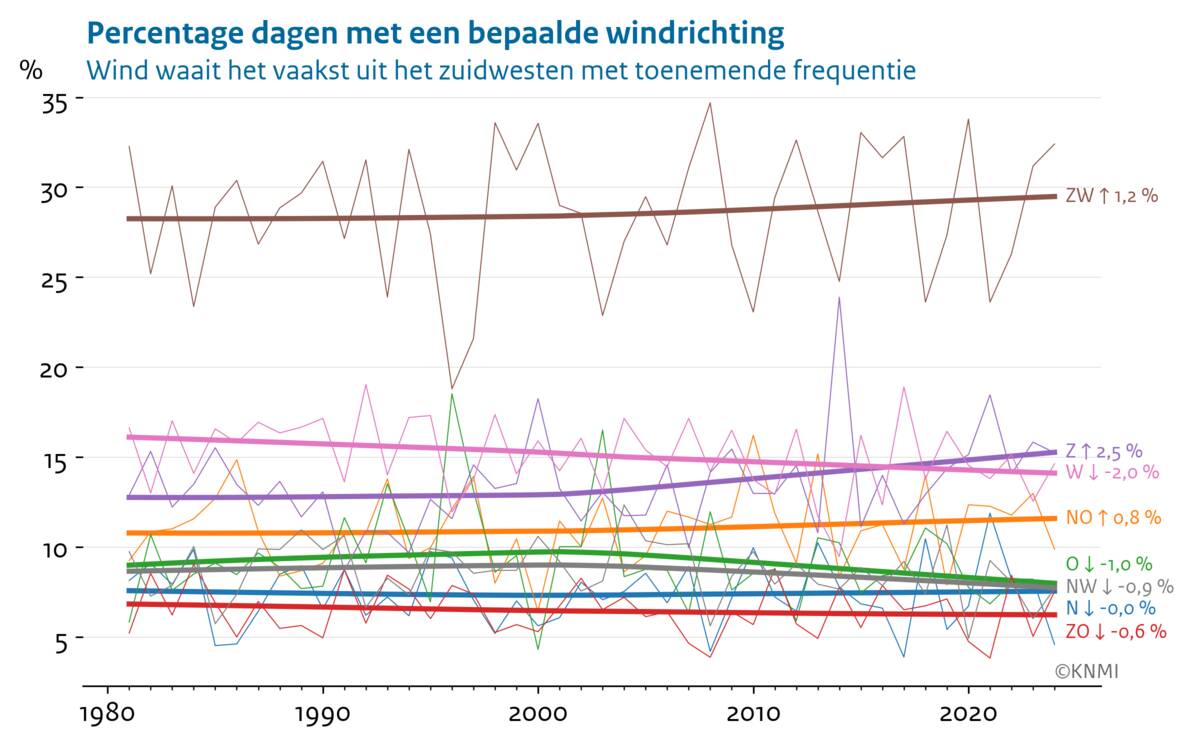 In mijn onderzoek heb ik uitgerekend dat de invloed van de wind beperkt is en zelfs een verminderend effect heeft op de zonnestraling. Dit komt doordat de windrichtingen die de laatste decennia vaker voorkomen meestal samenhangen met vochtige, bewolkte wind uit zee (zuid tot zuidwest) (zie afbeelding 3). De toename bedraagt ruim drie procent, terwijl andere richtingen een afname laten zien waaronder die met droge, heldere lucht (oost tot zuidoost). Hierdoor draagt de verandering in windrichting niet bij aan de stijging in zonnestraling, maar remt deze juist enigszins af.