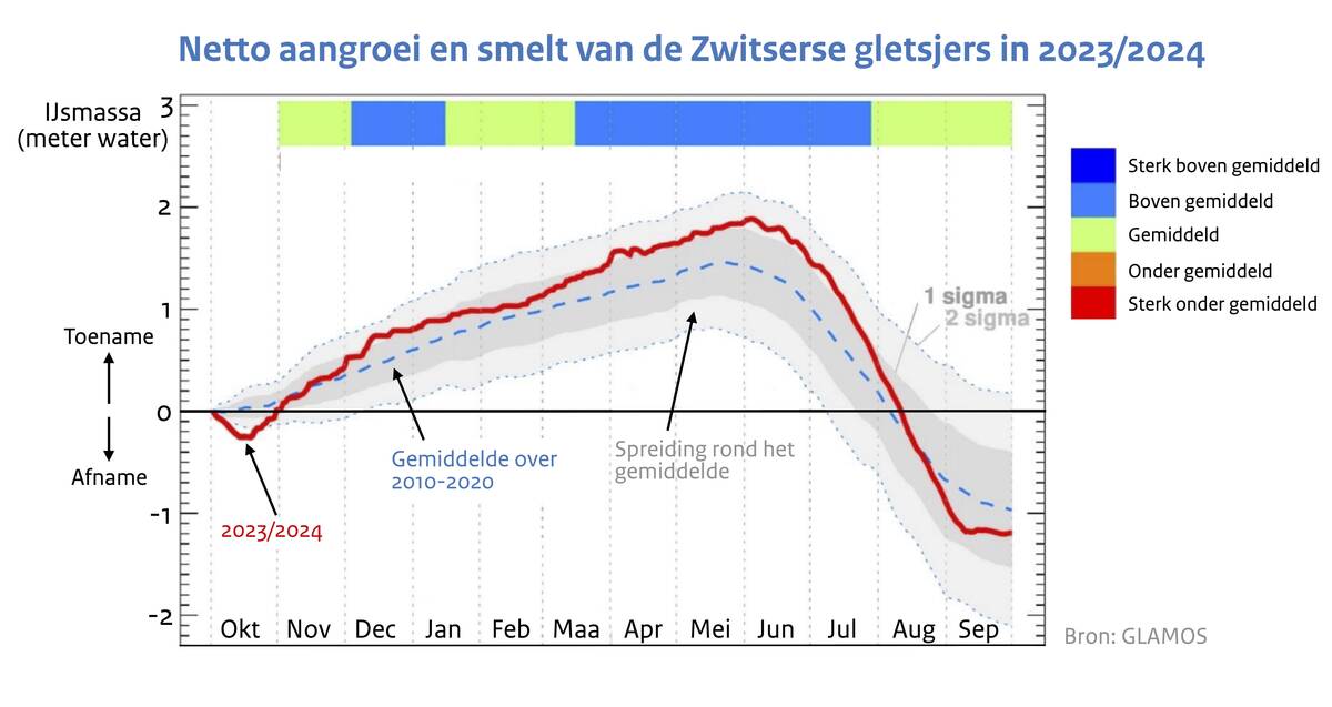 Elk jaar wordt eind september de massabalans van de Alpengletsjers opgemaakt. In de zomermaanden gaan de gletsjers smelten en verdampen als ze bloot komen te liggen wanneer de “verse” wintersneeuw is weggesmolten. Met vaste referentiepunten in de sneeuwlagen wordt gekeken hoeveel een gletsjer netto is gegroeid of geslonken, uitgedrukt in meter of gewicht van water. Afbeelding 1 laat zien dat de Zwitserse gletsjers in 2024 tot augustus een bovengemiddeld hoge massa hadden. Dit kwam door veel sneeuwval. Augustus 2024 verliep in het hooggebergte record warm met 3,8 °C boven gemiddeld (1991-2020) en heeft een smeltrecord voor augustus opgeleverd (mede geholpen door weinig bewolking en opgehoopt Saharazand wat minder zonlicht reflecteert).
