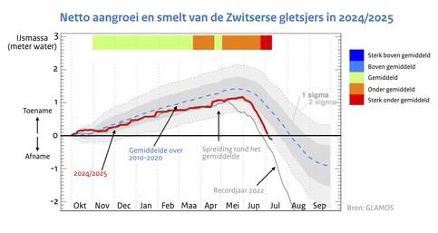 Vorig jaar rond deze tijd lagen de Alpengletsjers nog uitstekend beschermd onder een uitzonderlijk sneeuwdek. Daarna ging de zomersmelt toch nog onverwacht snel en heeft de afgelopen winter weinig sneeuw gebracht. Vanaf deze week tot ongeveer oktober zal er weer meer ijs afsmelten dan er aan sneeuwval afgelopen winter is bijgekomen. Deze vroege start van de afname in de hoeveelheid gletsjerijs levert mogelijk veel ijsverlies op voor 2025.