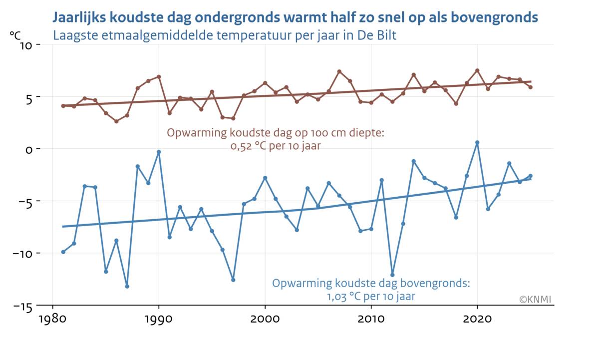 Jaargemiddeld is de temperatuur ondergronds 0,7 graden hoger dan bovengronds. Dit verschil is in de afgelopen 45 jaar redelijk constant gebleven: de temperatuur op 1 meter diepte is met ruim 0,4 graden per tien jaar even hard opgewarmd als de lucht erboven (afbeelding 3).
