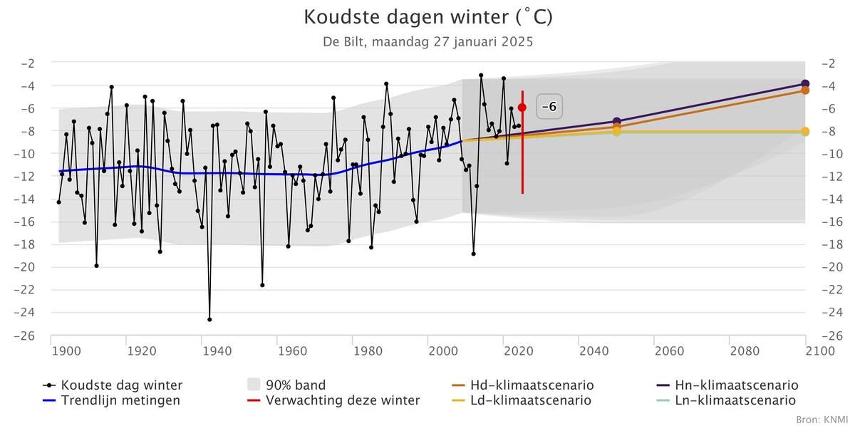 Voor de toekomst laat de grafiek de verwachte waardes zien voor de vier KNMI-klimaatscenario's. De koudste dag warmt nog verder op tot gemiddeld rond -8 graden in het laagste scenario in 2100 en rond -4 graden in het hoogste. Het maakt voor de opwarming in Nederland veel uit hoeveel CO2 de wereld nog gaat uitstoten tussen nu en 2100.