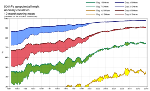 Weermodellen kunnen geen zinvolle vooruitzichten leveren zonder meetgegevens. De modellen hebben immers een begintoestand nodig om verwachtingen uit te kunnen rekenen. Hoe betrouwbaarder de begintoestand, hoe beter de verwachtingen kunnen zijn. De toename in de betrouwbaarheid komt door verbeteringen in de weermodellen, door betere wetenschap en krachtigere computers en door betere meetgegevens uit bijvoorbeeld satellieten. Dat kwaliteit van de weersverwachtingen in de loop der jaren inderdaad beter is geworden, laat figuur 3 zien. De toename van de curves tonen hoe de betrouwbaarheid van de verwachtingen steeds groter wordt. De driedaagse verwachting (blauw) is het meest betrouwbaar. Lange termijn vooruitzichten (geel) zijn het minst betrouwbaar.