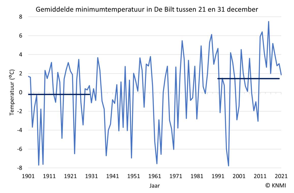 Uit de decadenormaal van weerstation De Bilt blijkt dat de laatste dagen van het jaar in het huidige klimaat (1991-2020) gemiddeld een maximumtemperatuur van 6,3 graden hebben. Dit is hoger dan begin vorige eeuw (1901-1930), toen de gemiddelde maximumtemperatuur nog 5,2 graden bedroeg. Ook de minimumtemperatuur, die een indicatie geeft van de temperatuur in de nacht, is gestegen: waar de gemiddelde minimumtemperatuur tussen 1901 en 1930 met -0,2 graden nog onder het vriespunt lag, ligt deze nu 1,5 graden boven nul. Nachtvorst tijdens de kerst wordt dus steeds zeldzamer (Figuur 1).