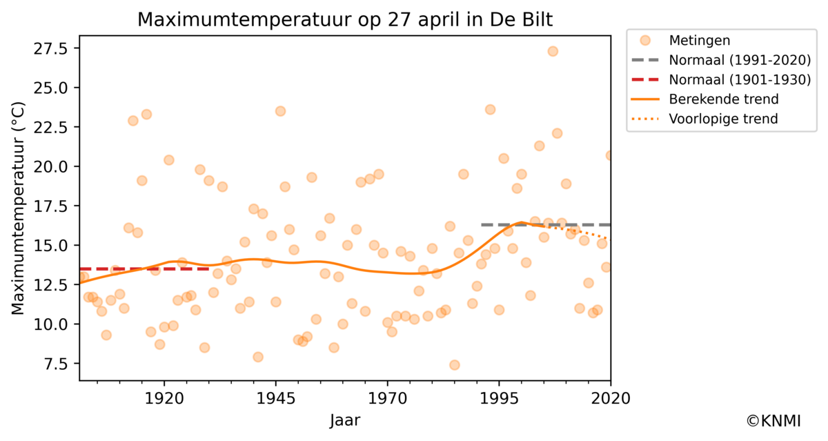 * Als 27 april op een zondag valt, wordt Koningsdag een dag eerder gevierd. Dit was bijvoorbeeld het geval in 2014 en hier is rekening mee gehouden in Figuur 1. Voor de klimaatanalyse in Figuur 2 is echter 27 april aangehouden, om de trend te kunnen baseren op een consistente dag. Doordat we naar de data van een enkele dag in het jaar kijken en niet naar het gemiddelde van een langere periode, heeft het grillige weer een relatief grote invloed op de berekening van de temperatuurtrend volgens de KNMI-methode. Dit is waarschijnlijk de reden dat je, ondanks de waargenomen toename in temperatuur de afgelopen decennia, geen consistente toename in de berekende trend terugziet.