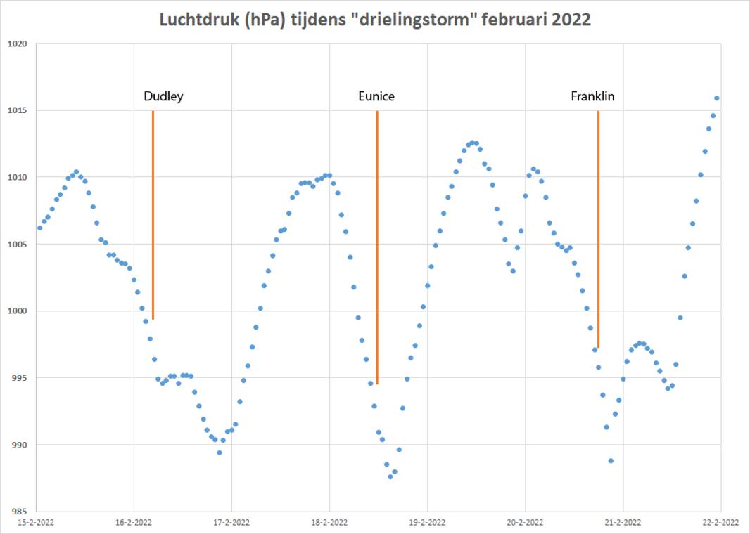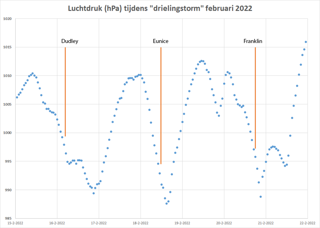 Een voorbeeld van dergelijke plotselinge drukdalingen zagen we tijdens de drielingstorm van afgelopen winter. Toen raasden Dudley, Eunice en Franklin in één week tijd over Nederland. Aangezien de stormen snel overtrokken, daalde de luchtdruk snel in grote delen van Nederland (zie figuur 2 voor de route die storm Eunice volgde). De snelle drukdaling is goed te zien in de luchtdruk voor station De Bilt (figuur 3). Bij elke overkomst van een storm daalde de luchtdruk met ruim 10 hPa. Tijdens Eunice daalde de luchtdruk het meest in 6 uur tijd, ongeveer 11 hPa met tijdelijk zo'n 6 hPa in 3 uur tijd. Tijdens Franklin daalde de luchtdruk zelfs nog iets sneller in 3 uur tijd, ongeveer 7 hPa. Alle drie de stormen haalden ruim het criterium van 6 hPa in 6 uur tijd.