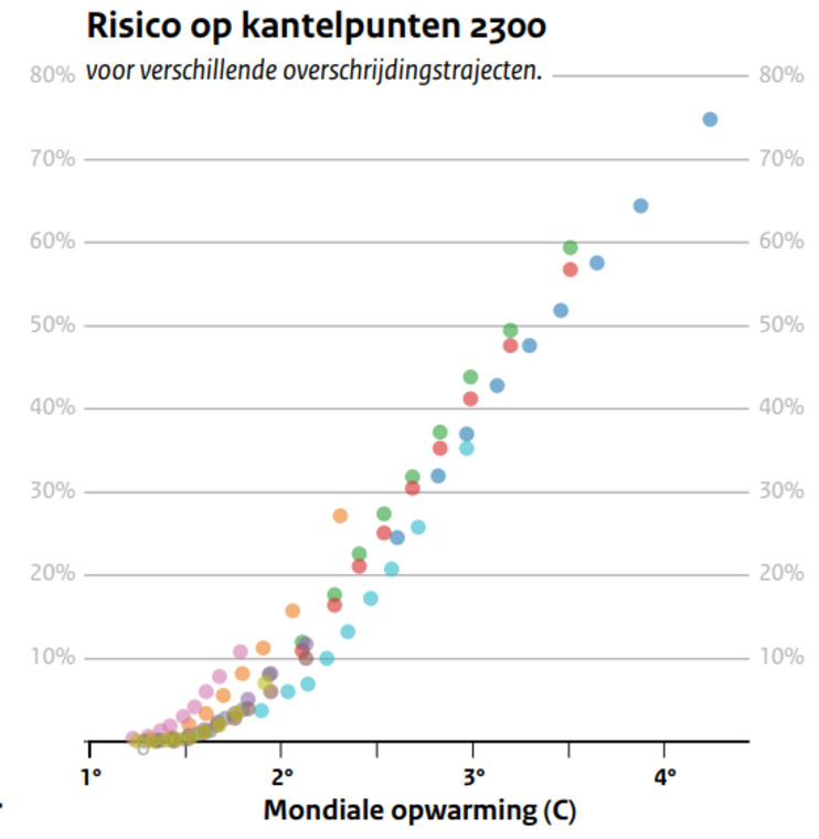 Bovendien wordt het risico van overschrijding van kantelpunten steeds groter naarmate de opwarming langer en hoger boven de 1,5 graden uitkomt. Kantelpunten zijn abrupte veranderingen, waarbij (een onderdeel van) het klimaatsysteem instabiel raakt en in een nieuwe evenwichtssituatie terecht komt. Vaak zijn deze veranderingen onomkeerbaar op menselijke tijdschalen.