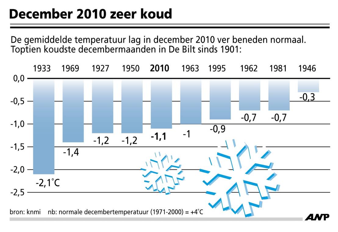 De gemiddelde temperatuur over de afgelopen maand was in De Bilt -1,1 graden waar +4,0 graden normaal is voor de kerstmaand. Zo'n grote afwijking is in december in ruim veertig jaar niet voorgekomen. December 1969 was met -1,4 graden nog iets kouder.