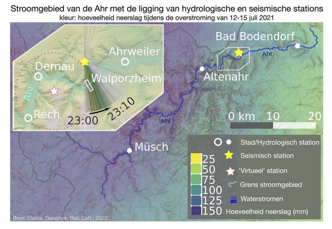 Het is bekend dat seismische stations niet alleen trillingen van aardbevingen kunnen meten, maar ook trillingen van explosies, stormen en aardverschuivingen. Uit een recente Duitse studie blijkt nu dat ook trillingen van overstromingen goed meetbaar zijn met een seismometer. De methode is ontwikkeld nadat onderzoekers ontdekten dat de overstroming in de Duitse Eiffel in juli 2021 zichtbaar was in de metingen van het bestaande seismische station in de Ahr vallei op 1.5 km afstand van de rivier (figuur 1).