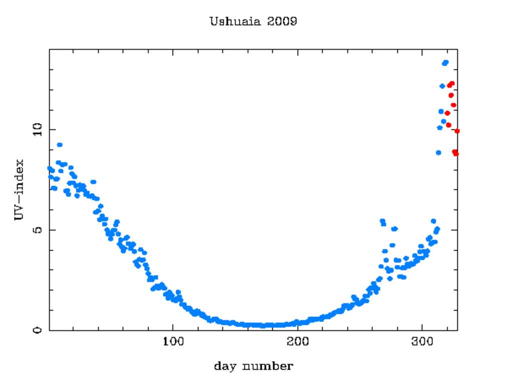 Restanten van het ozongat boven de Zuidpool komen vaker boven Zuid-Amerika terecht, gemiddeld om de paar jaar. In Ushuaia (Argentinië) heeft de dikte van de ozonlaag volgens metingen van het KNMI waarden bereikt van 182 Dobson eenheden. Dat is laag genoeg om van een ozongat te spreken. Ushuaia op Vuurland ligt op ongeveer 55 graden Zuiderbreedte en kent een zeeklimaat. Om een hoge zonkracht te krijgen is het nodig dat de zon dan ook relatief hoog aan de hemel staat. In Zuid-Amerika is het nu volop lente en klimt de zon dagelijks iets hoger. Een zonkracht van tussen 12 en 14 hoort tot de hoogste die ooit zijn gemeten. Zulke hoge getallen zijn doorgaans alleen in tropische of subtropische gebieden te vinden.
