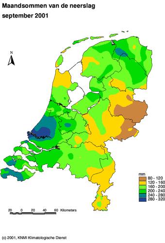 September 2001 was extreem nat: in Hoek van Holland is 314,1 mm gevallen, waarvan 107 mm op 19 september.Landelijk is deze maand hiermee de natste september tenminste sinds 1854. Het record was 269 mm in 1998 te Steenbergen. Kijken we naar de 24 uurs aftappingen sinds 1 september dan valt de neerslag die deels op 31 augustus is gevallen er buiten en komen we voor Hoek van Holland op 280 mm. Ook dat is een nieuw record. Hoek van Holland was ook in augustus zeer nat met een maandsom van 212,5; in twee maanden is hier een recordsom van 526,6 mm gevallen. Het vorige record voor de tweemaandelijkse som van de neerslag stond op naam van Callantsoog waar oktober en november 2000 samen 448,5 mm opleverden. Onderstaand een overzicht van de hoogste tweemaandelijkse neerslagsommen.