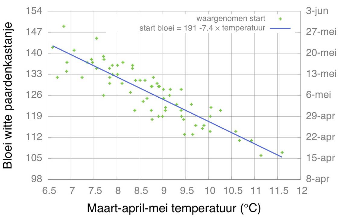 Dit blijkt uit het natuurkalender-onderzoek van Arnold van Vliet, bioloog aan Wageningen University naar de start van de bloei van de witte paardenkastanje: “Uit historische gegevens blijkt dat voor elke graad dat het voorjaar warmer is, de witte paardenkastanje ruim een week eerder in bloei komt.” (Figuur 1)