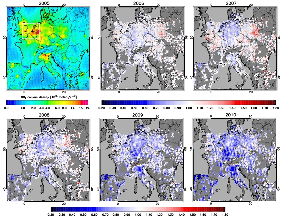 Op basis van satellietmetingen van het Nederlandse ozon meetinstrument (OMI) hebben Patricia Castellanos en Folkert Boersma van het KNMI en verbonden aan de TU Eindhoven, jaarkaarten gemaakt van NO2-concentraties boven Europa. De kaarten tonen duidelijk dat de NO2-concentraties tussen 2004 en 2010 jaarlijks verschillen. Daarnaast laten de zesjarige metingen zien dat de ontwikkeling van dit soort luchtvervuiling grillig verloopt, en niet lineair zoals eerder werd aangenomen.
